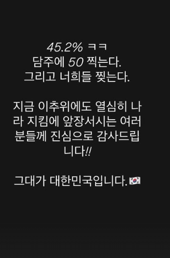 앞서 JK김동욱은 12일 윤석열 대통령의 국정 지지도를 언급하며 "45.2% ㅋㅋ 담주에 50 찍는다. 그리고 너희들 찢는다. 지금 이 추위에도 열심히 나라 지킴이에 앞장서시는 여러분들께 진심으로 감사드립니다. 그대가 대한민국입니다"라고 전했다.