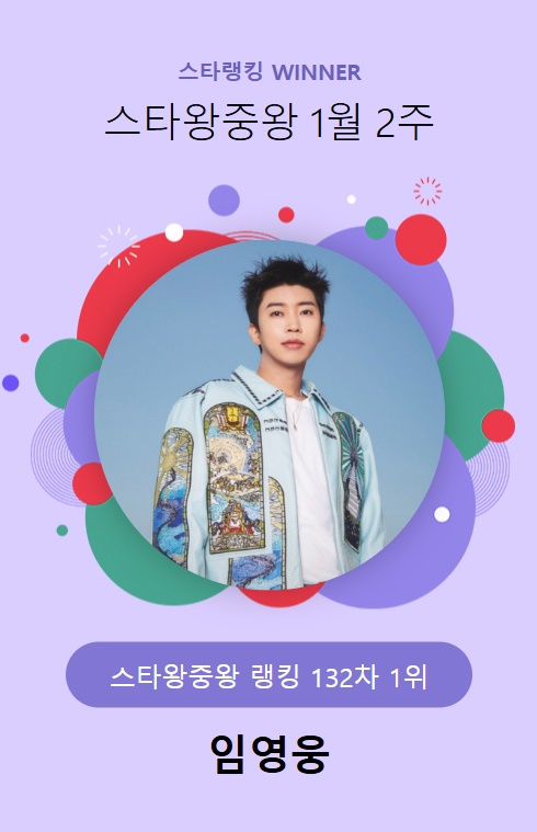임영웅은 지난 10일 오후 3시 1분부터 17일 오후 3시까지 진행된 1월 2주(132차) 스타왕중왕 랭킹 투표에서 15만 4073표를 획득하고 1위를 수성했다.