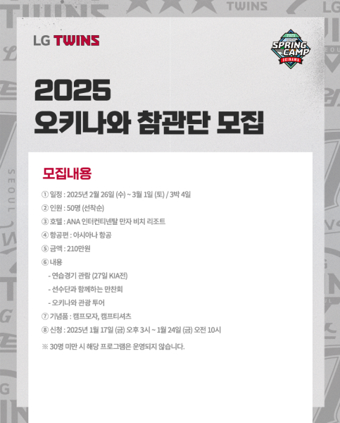 이번 2025 오키나와 전지훈련 참관단은 2월 26일부터 3월 1일까지 3박 4일 일정으로 LG 오키나와 전지훈련지를 방문해 연습경기 관람, 선수단과 함께하는 만찬, 오키나와 주요 관광지 여행 등을 즐길 수 있다. 또한 참관단 전원에게는 기념품으로 2025시즌 LG 오키나와 스프링캠프 모자와 티셔츠가 지급된다.