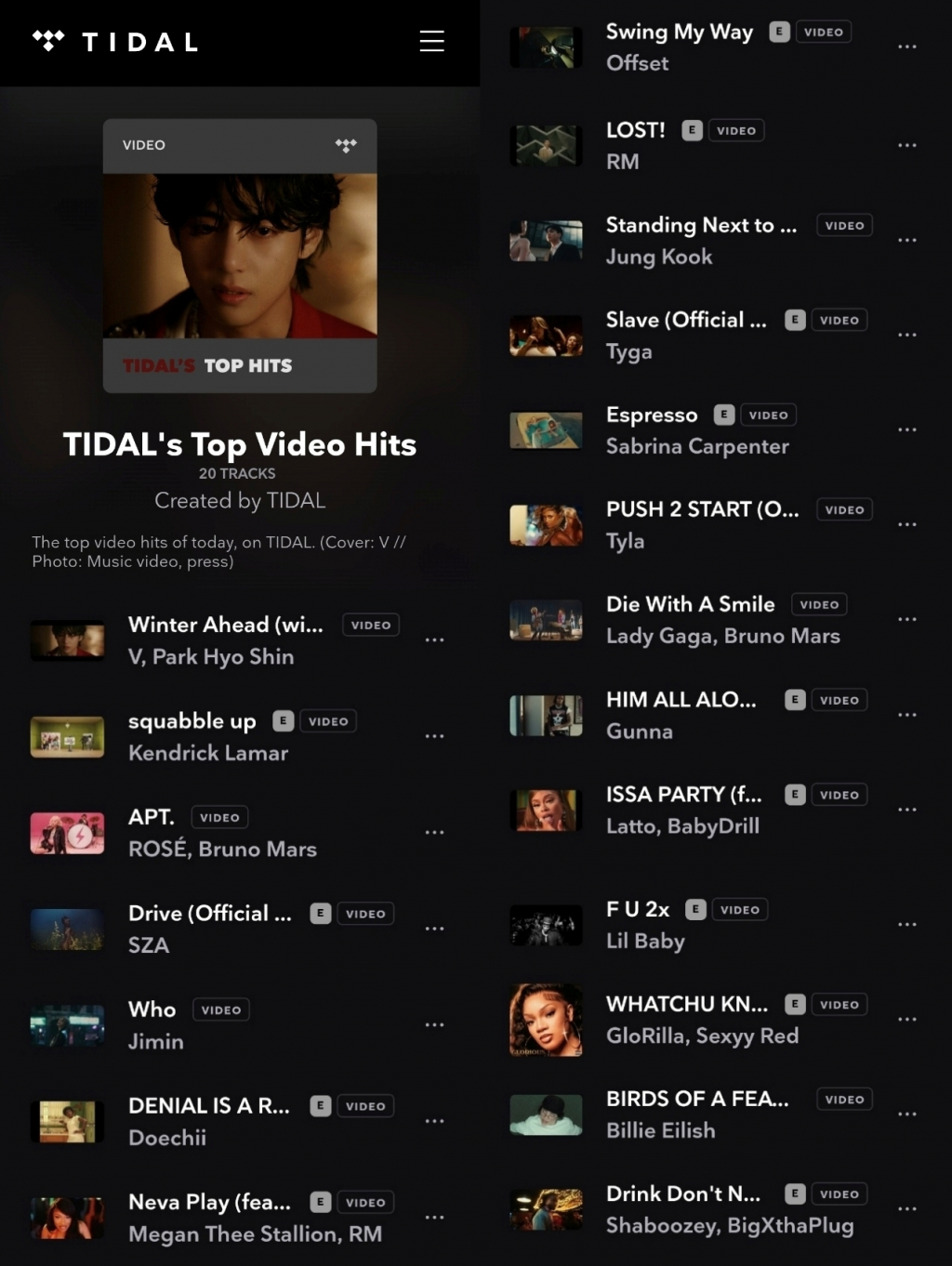 뷔의 솔로곡 'Winter Ahead(with PARK HYO SHIN)'는 고음질 글로벌 스트리밍 플랫폼 글로벌 '타이달 톱 비디오 20'에 5주 연속 1위를 차지했다.