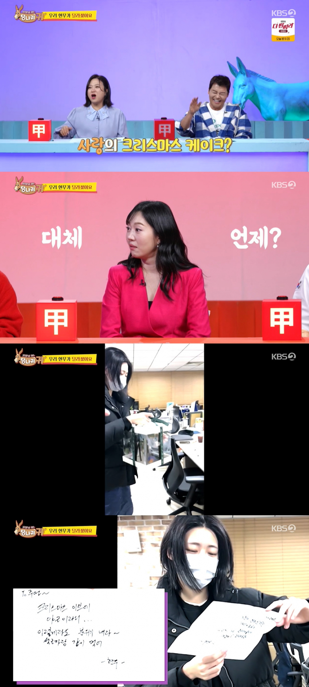 엄지인은 "현무 선배가 편지도 있다더라"고 말했고, 홍주연이 받은 편지에는 "크리스마스 이브에 야근이라니, 이렇게라도 분위기 내라. 석근자랑 같이 먹어"란 문구가 담겨 훈훈한 분위기를 만들었다.