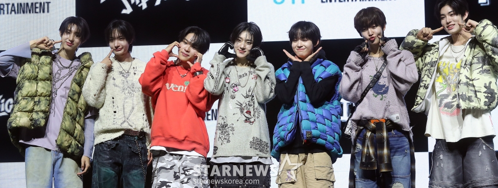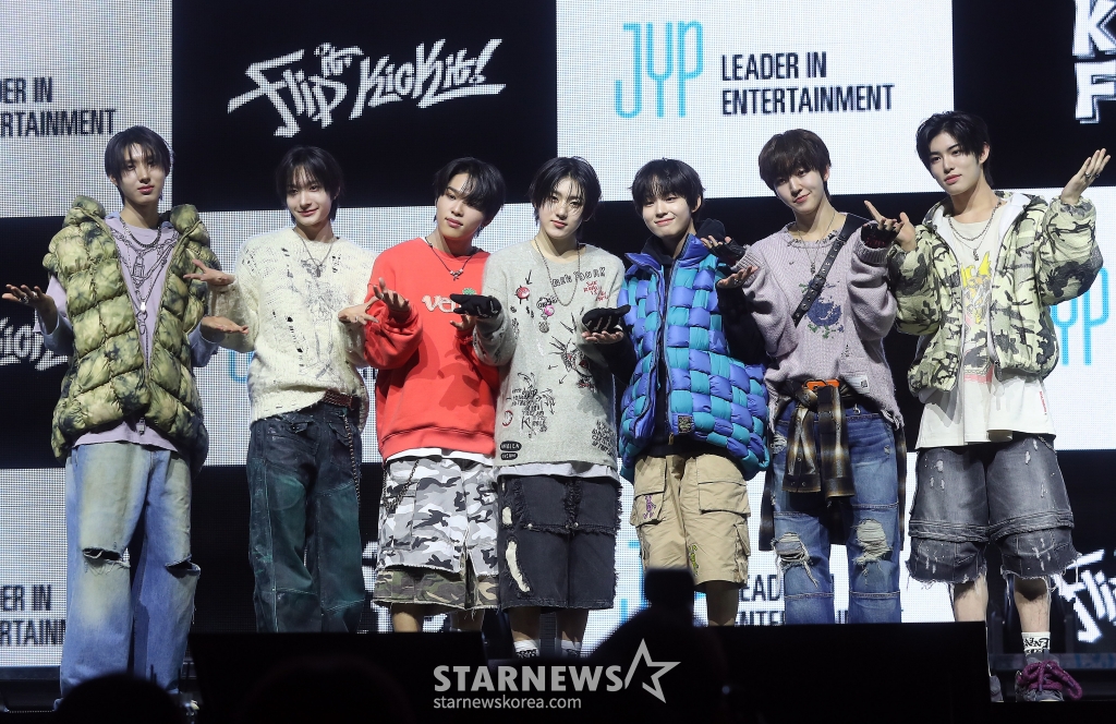 JYP 신인 그룹 킥플립(KickFlip)이 20일 오후 서울 광진구 예스24 라이브홀에서 진행된 첫 미니 앨범 'Flip it, Kick it!'(플립 잇, 킥 잇!) 발매 기념 쇼케이스에 참석해 포즈를 취하고 있다.