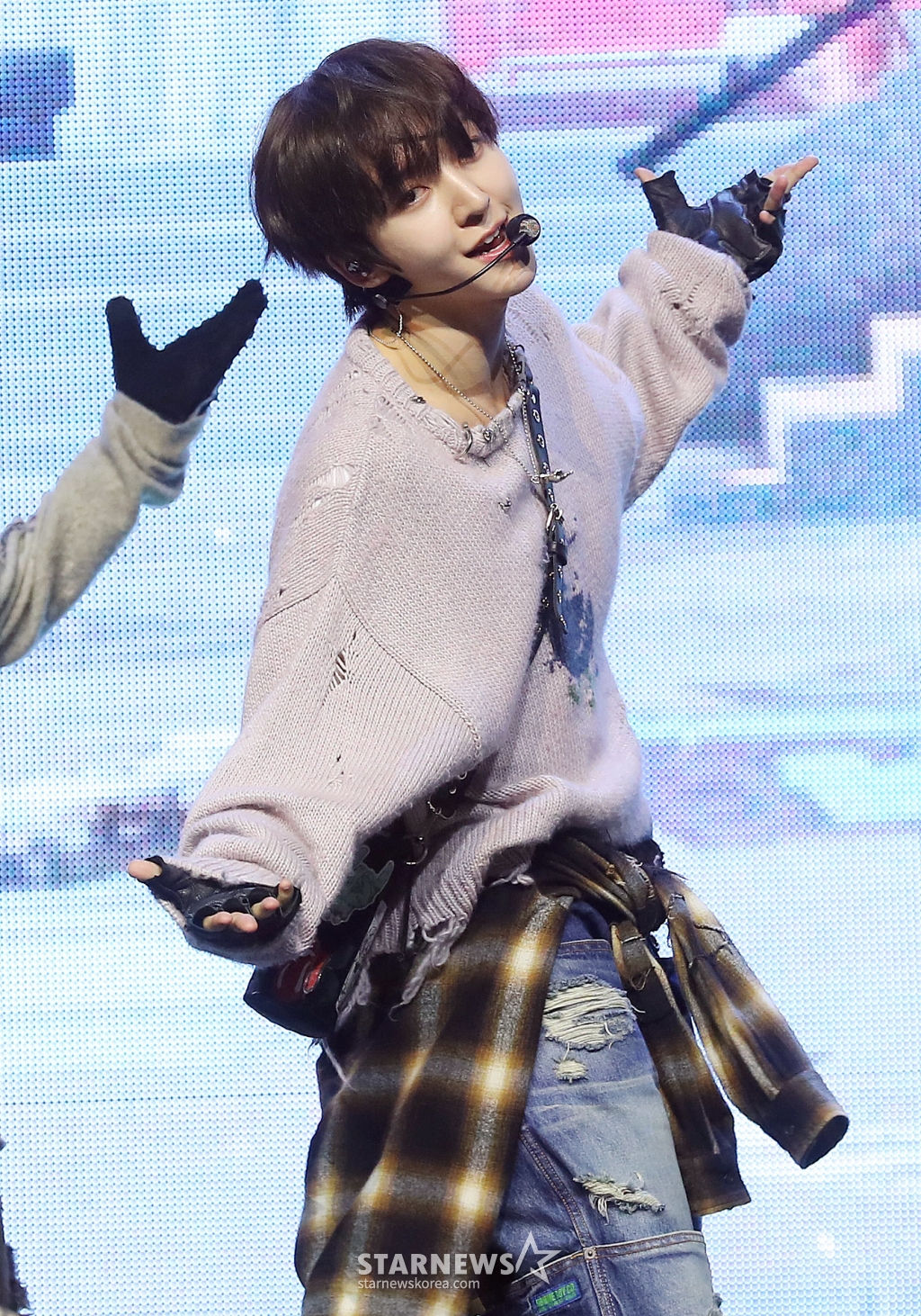 JYP 신인 그룹 킥플립(KickFlip) 동현이 20일 오후 서울 광진구 예스24 라이브홀에서 진행된 첫 미니 앨범 'Flip it, Kick it!'(플립 잇, 킥 잇!) 발매 기념 쇼케이스에 참석해 멋진 무대를 선보이고 있다.