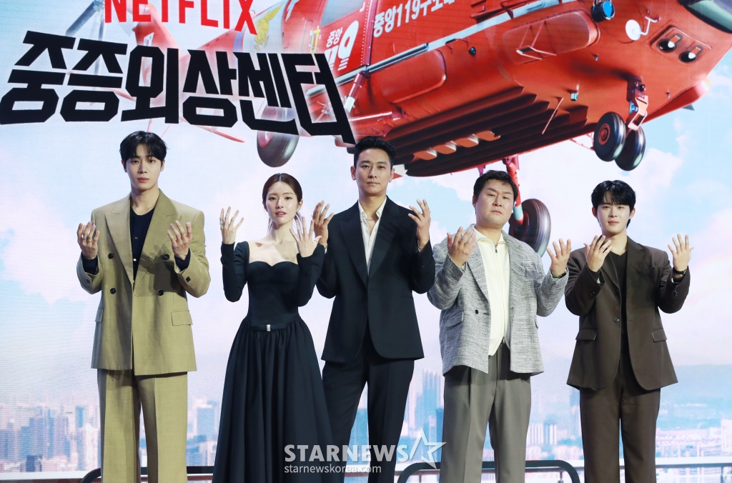 배우 추영우, 하영, 주지훈, 윤경호, 정재광이 21일 오전 서울 강남구 그랜드 인터컨티넨탈 파르나스 호텔에서 진행된 넷플릭스 오리지널 시리즈 '중증외상센터' 제작발표회에 참석해 포즈를 취하고 있다.