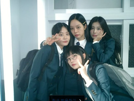 사진에는 혜리가 오는 2월 10일 첫 공개되는 STUDIO X+U 드라마 '선의의 경쟁' 배우들과 촬영장에서 학생 케미스트리를 맞추고 있었다.
