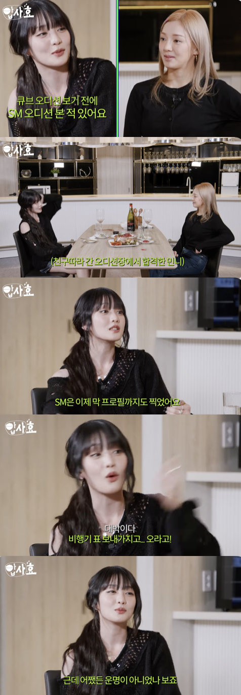 SM 오디션에서 합격한 민니는 "SM에서 프로필까지도 찍었다. 프로필 찍고 연락을 준다고 했다. 그런데 큐브도 오디션을 봐둔 상태였다. (큐브에서는) 1주일에서 2주일 뒤에 바로 비행기표를 보내가지고 오라고 했다"라며 SM 대신 큐브 행을 선택한 이유를 밝혔다.