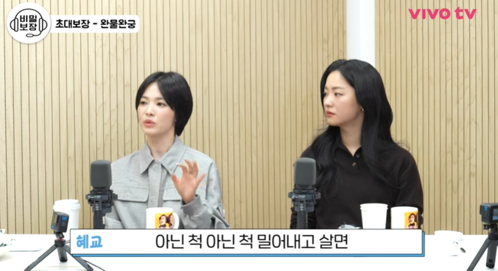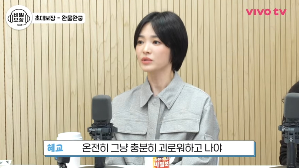 이날 송혜교는 자신이 모 인터뷰를 통해 '괴로울 땐 충분히 괴로워라'라고 언급한 것에 대해 "왜냐하면 괴로운데 옆에서 누가 어떤 말을 해줘도 나아지지 않고 들리지도 않는다. 그래서 생각을 해봤더니 온전히 그냥 충분히 괴로워하고 나야 다음 시간 때에 더 훌훌 털어버리게 되는 것 같다. 그걸 계속 내가 너무 괴로운데 아닌 척하고 밀어내고 살면 괴로움이 더 오래 가는 것 같다"라고 말했다.