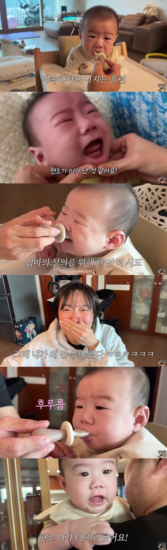 코미디언 강재준, 이은형이 아들 현조의 첫 이유식 먹이기에 성공했다. 이런 가운데 현조의 첫 아랫니가 포착됐다.