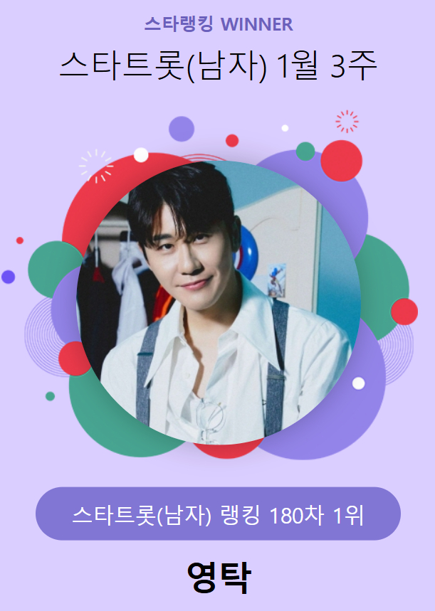 영탁은 지난 16일 오후 3시 1분부터 23일 오후 3시까지 진행된 1월 3주(180차) 스타랭킹 스타트롯 남자 랭킹 투표에서 이찬원, 장민호를 꺾고 1위를 차지했다.