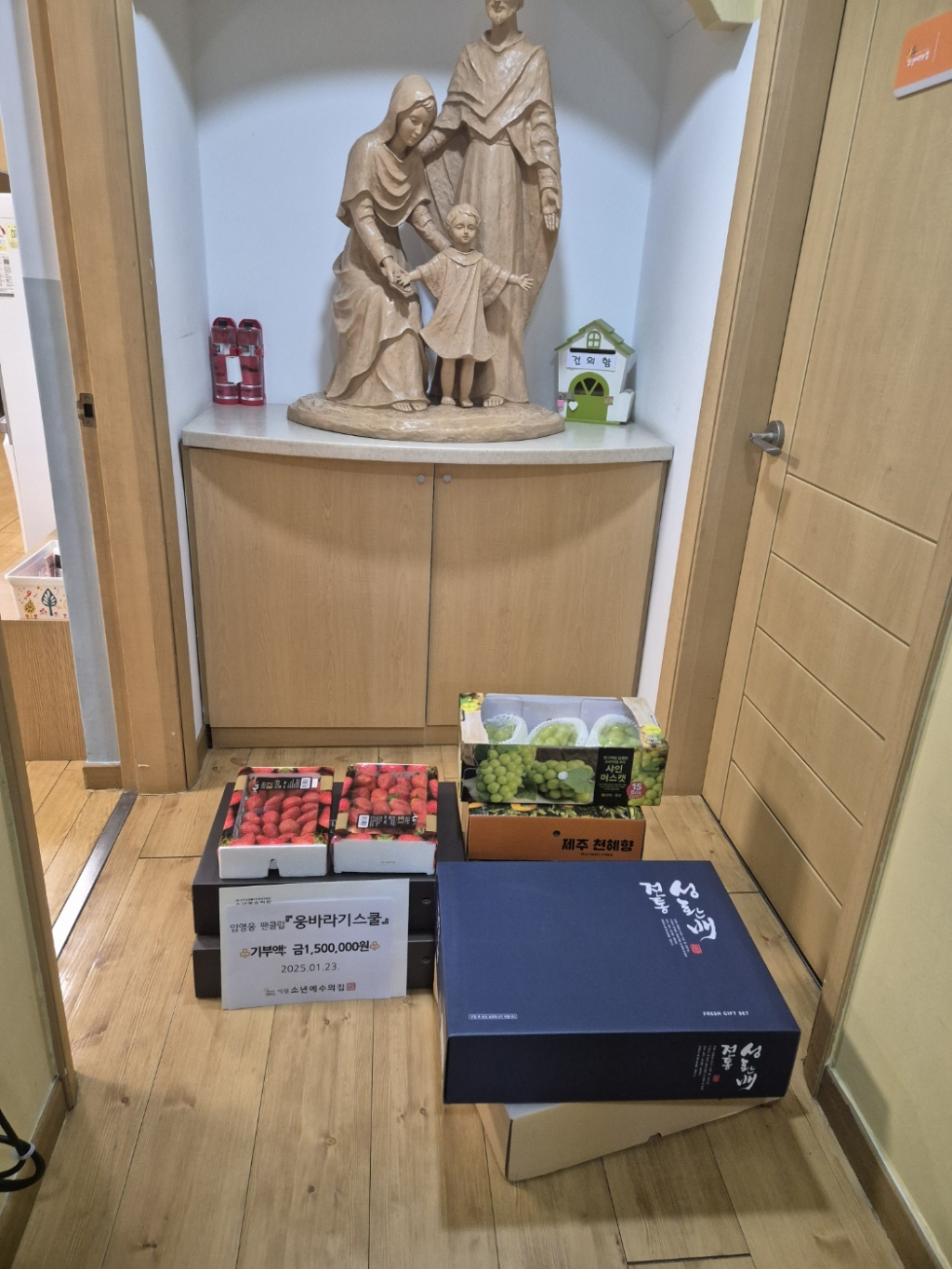 '잠실 웅바라기스쿨'은 이날 정기후원금 150만 원과 설 연휴 50만 원 상당의 과일 박스를 '소년예수의 집'에 전달했다.