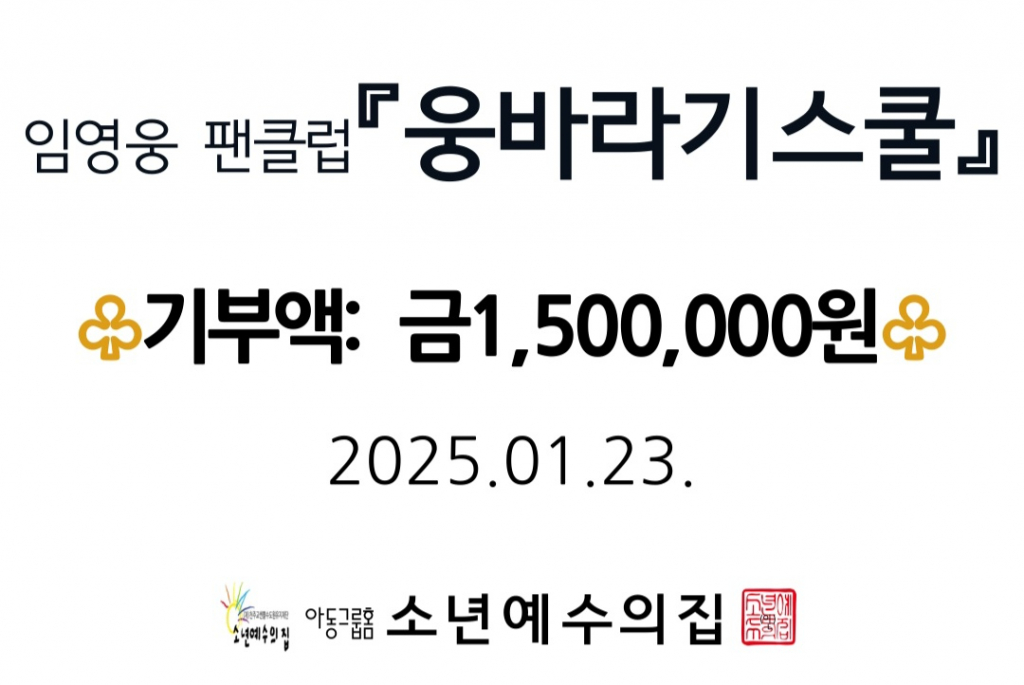 임영웅 팬클럽 '잠실 웅바라기스쿨'은 1월 23일 서울 송파구 '소년예수의 집'에서 15번째 나눔 봉사를 했다.