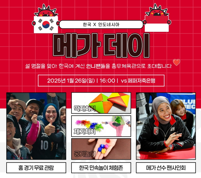 정관장 레드스파크스 배구단은 "오는 26일 오후 4시 대전 충무체육관에서 열리는 광주 페퍼저축은행과 홈경기를 '메가 데이'로 지정하고 한국과 인도네시아가 함께 즐기는 설 명절을 콘셉트로 다양한 홈경기 이벤트를 진행한다"고 24일 밝혔다.