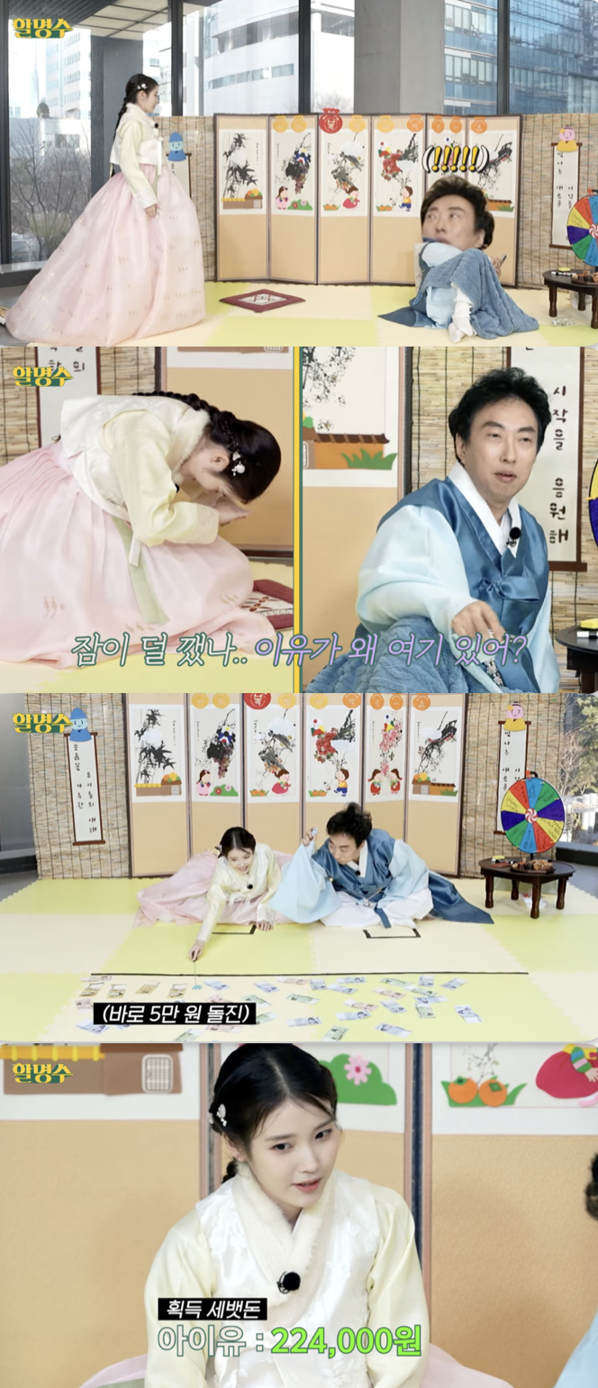 결국 아이유는 다른 출연진들과 마찬가지로 게임을 통해 세뱃돈 22만4000원을 획득했으나 '할명수' 제작진 회식비에 보태는 사려 깊은 모습을 보였다.