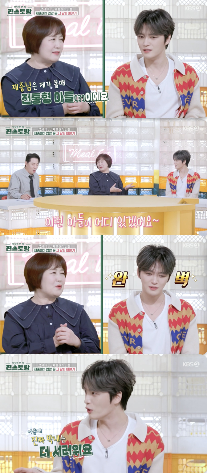 특히 김재중을 향한 팬심을 드러내며 "(김)재중 님은 제가 볼 때 전통형 아들이다. 이런 아들이 어디 있냐. 이렇게 다정하고, 따뜻하고, 요리 잘하는 완벽한 아들이 어디 있겠냐"라고 칭찬 폭격을 날렸다.