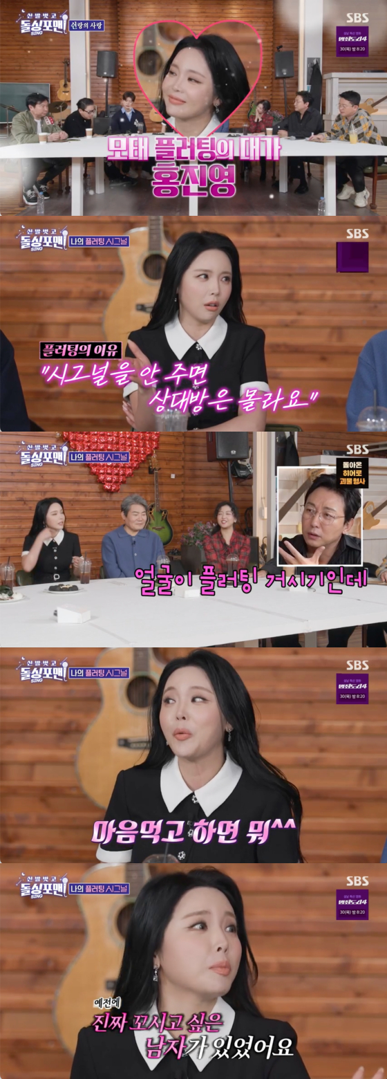 이에 홍진영은 "시그널을 안 주면 상대방은 모른다. '내게 관심이 없구나'를 느끼면 관계는 이어지지 않는다. 상대방이 자려고 누웠을 때 내 생각이 나야 한다. 마음을 잘 안 먹긴 하지만 마음 먹으면 뭐"라고 플러팅 자신감을 드러냈다.