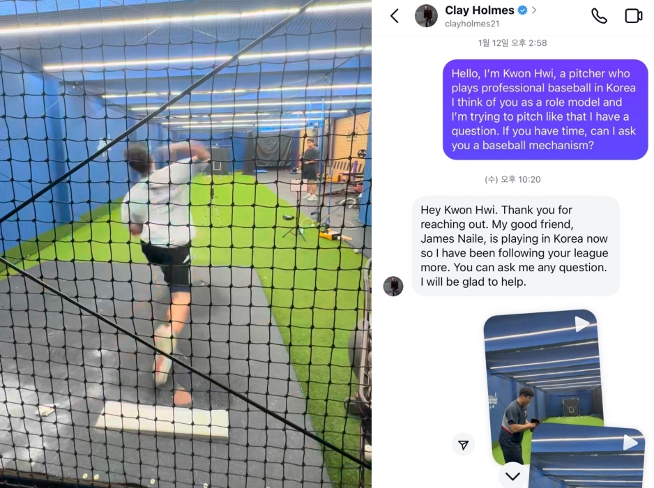 그런 권휘가 최근 뉴욕 메츠의 특급 마무리 투수 클레이 홈스(32·뉴욕 메츠)에게 SNS(소셜네트워크서비스)를 통한 DM을 보내 화제다. 권휘는 평소에도 간결한 팔 동작을 바탕으로 투구하면서 구속을 유지하는 홈스를 롤모델로 삼고 있다. 지난 시즌 최고 구속 151km까지 찍은 권휘이지만, 본인도 불필요한 동작이 많아졌다고 생각하는 상황.