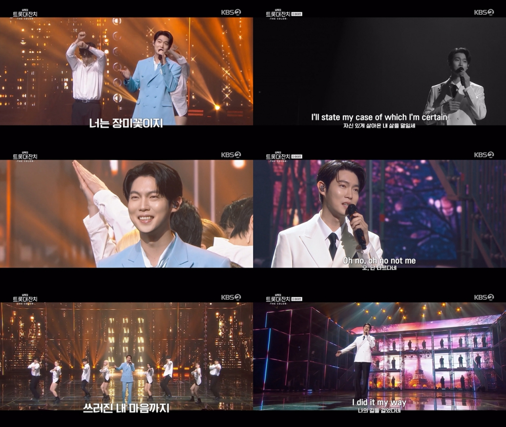 이어진 무대에서는 화이트 컬러의 수트를 입은 손태진이 20명의 대형 합창단과 함께 미국의 전설적인 가수 프랭크 시나트라의 'My Way'를 가창했다. 'My Way'는 손태진이 지난해 9월 KBS2 '불후의 명곡'에 출연해 '국민 배우' 이순재를 향한 진심 어린 무대를 펼치며 1위를 차지한 곡이다. 흑백에서 컬러로 이어지는 화면 구성 속에서 손태진은 진중한 목소리로 또 한 번의 전율을 선사했다.