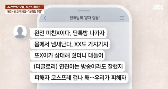 또한 '사건반장'은 고인을 향해 동료 기상캐스터들이 카카오톡 단톡방에서 괴롭힌 내용도 공개했다. 이에 따르면 한 기상캐스터는 "(오요안나) 완전 미친 X이다. 단톡방 나가자. 몸에서 냄새 난다. XX도 마찬가지"라며 "또 X가 상대해줬더니 대들어. ('더 글로리') 연진이는 방송이라도 잘했지. 피해자 코스프레 겁나 해. 우리가 피해자"라고 말했다.