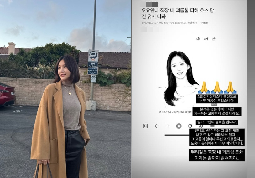 MBC 기상캐스터 출신 박은지가 세상을 떠난 후배 고 오요안나를 추모하며 직장 내 괴롭힘 문화가 밝혀져야 한다고 주장했다.