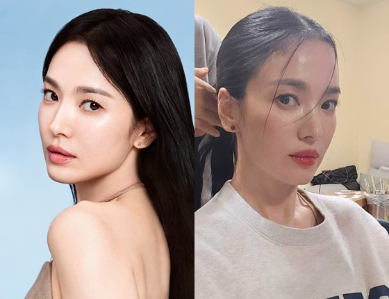 여기엔 송혜교의 변신 전후 모습이 담겼다. 하지만 송혜교는 독보적인 '모태 미녀'답게 보정 처리된 화보 컷과 별다른 차이가 없어 눈길을 끌었다. 각도를 무시한 '무보정' 셀카에서도 43세 나이가 믿기지 않는 초절정 동안 비주얼을 자랑한 송혜교다.
