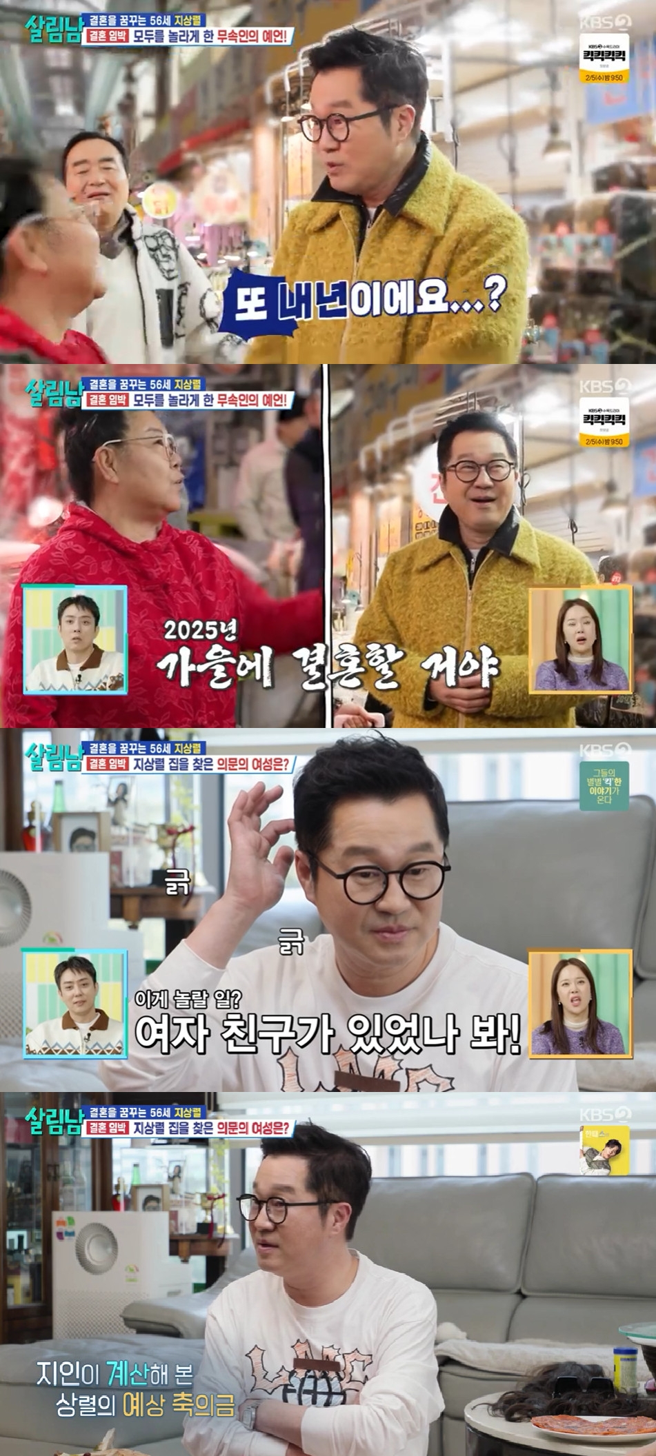 1일 방송된 KBS 2TV '살림하는 남자들'(이하 '살림남')에서는 지상렬이 "내년에 인연이 생길 것"이라는 무속인의 예언을 들었다.