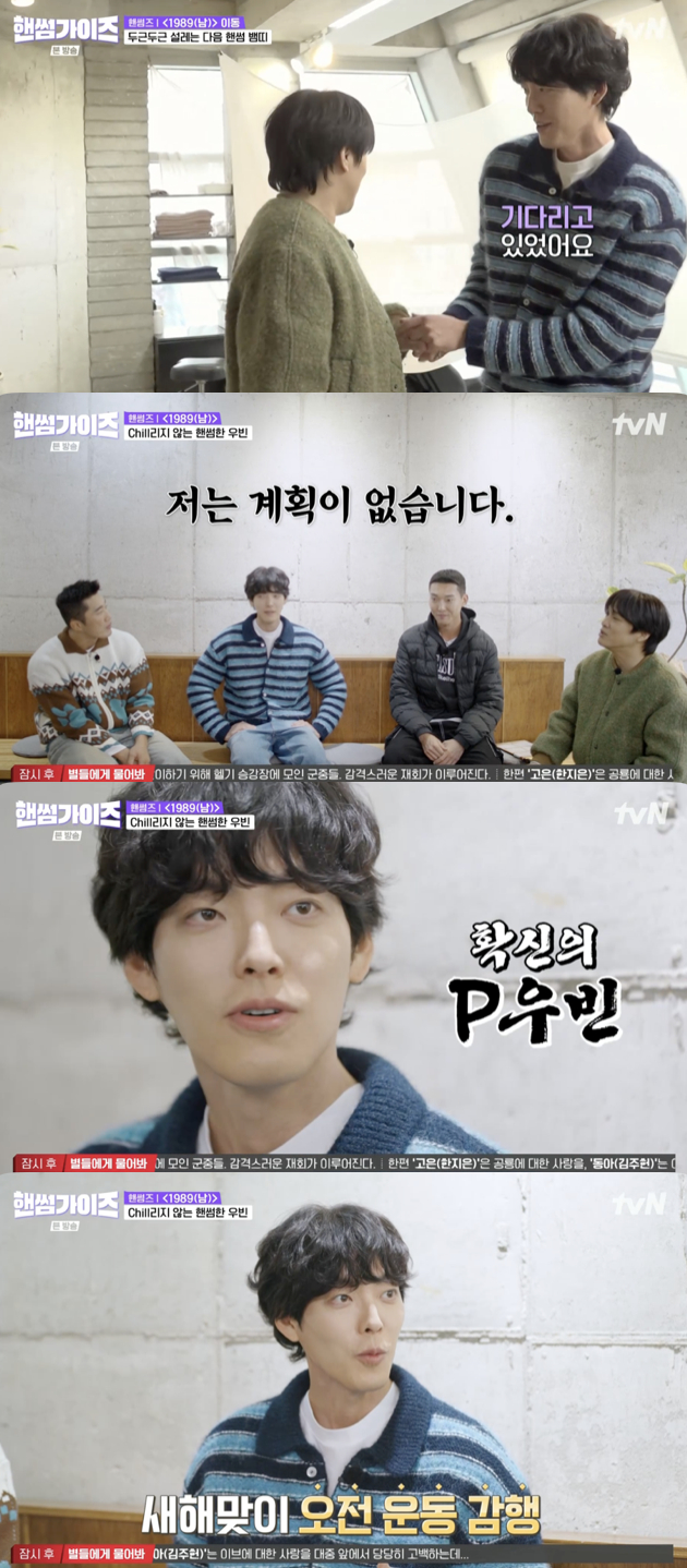 '핸썸즈' 팀과 조우한 김우빈은 신년 계획을 묻는 질문에 "전 계획이 없다. 저는 완전 (MBTI 성향이) P다. 원래는 컨디션이 오후가 좋아서 오후에 간다. 그런데 오늘은 갑자기 일하기 전에 가보고 싶어서 오전에 갔다"라며 계획 없이 기분에 따라 일정을 짜는 성향이라고 고백했다.