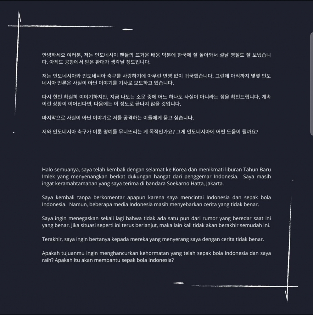 신 감독은 1일 개인 사회관계망서비스(SNS)를 통해 "인도네시아와 인도네시아 축구를 사랑하기에 아무런 변명 없이 귀국했다. 그런데 인도네시아 언론은 사실이 아닌 이야기를 기사로 보도하고 있다"며 "지금 소문 중 어느 하나도 사실이 아니라는 점을 확인한다. 이런 상황이 이어지면, 다음에는 이 정도로 끝나지 않을 것"이라고 밝혔다.