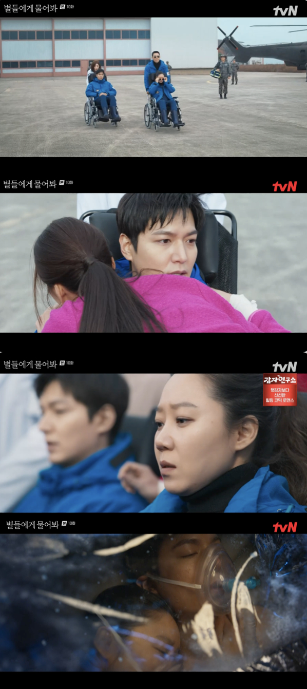 2일 방송된 tvN 토일드라마 '별들에게 물어봐' 10회에서는 지상관제센터 대원들의 고군분투에 힘입어 우주정거장에 낙오됐던 공룡(이민호 분)과 이브 킴(공효진 분)이 무사히 지구로 귀환했다.