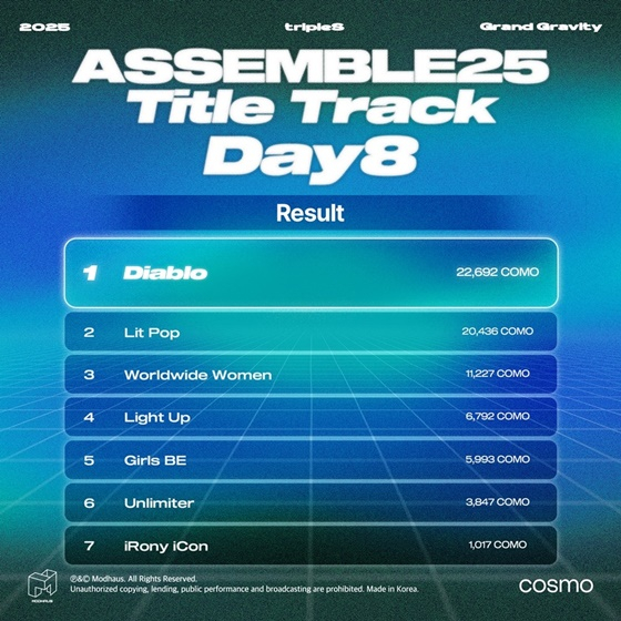 한편 글로벌 웨이브는 '그랜드 그래비티'를 통해 'Stranger Things'를 트리플에스 ASSEMBLE 25의 타이틀곡으로 선정했다. 또한 후보 곡들 중 아쉽게 1위를 하진 못했지만, 꼭 수록됐으면 하는 트랙을 고르는 추가 '그래비티'에서 'Diablo'가 선택을 받았다.