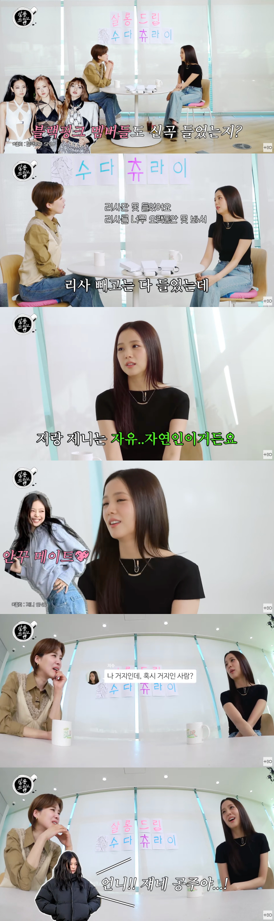장도연은 "곧 나올 신곡은 블랙핑크 멤버들이 들어봤냐"고 물었고, 지수는 "리사가 너무 바빠서 리사만 못 들었다. (제니와 로제는) 좋다고 해줬다"고 답했다.