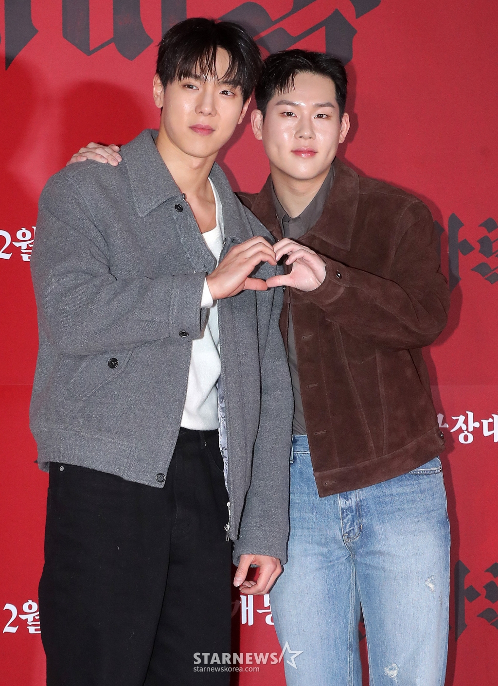 몬스타엑스 셔누, 주헌이 4일 오후 서울 송파구 롯데월드타워 롯데시네마에서 진행된 오컬트 애니메이션 '퇴마록' VIP 시사회에 참석해 포즈를 취하고 있다.