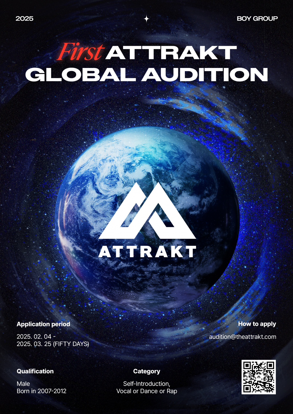 어트랙트는 4일부터 'First ATTRAKT GLOBAL AUDITION'을 개최하고, 차세대 보이그룹 멤버들을 찾는다.