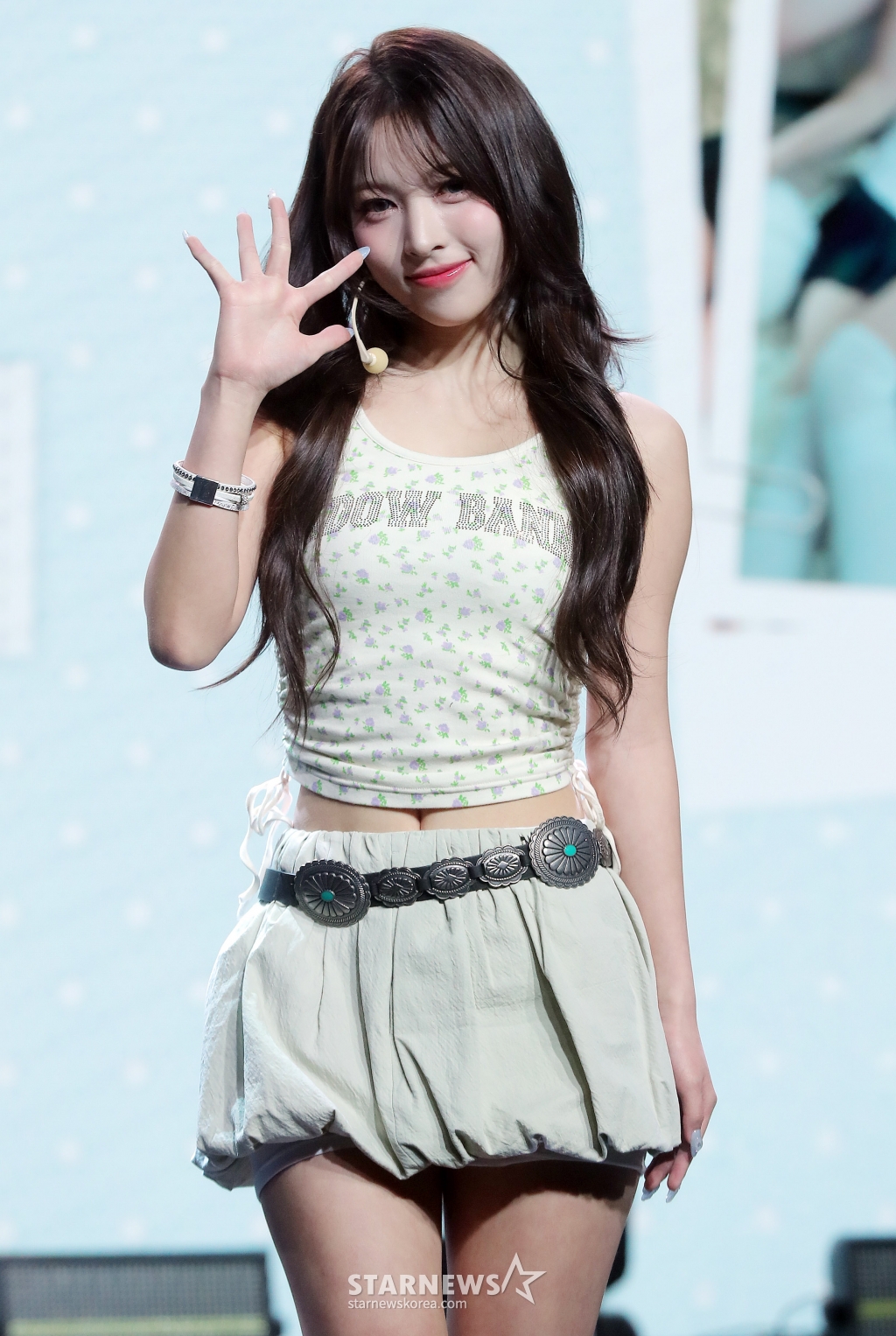 그룹 리센느(RESCENE) 메이가 5일 오후 서울 강남구 청담동 일지아트홀에서 진행된 두 번째 미니 앨범 'Glow Up'(글로우 업) 발매 기념 쇼케이스에 참석해 포즈를 취하고 있다.