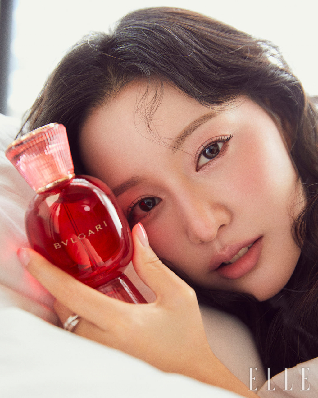 김지원만의 흡인력 넘치는 눈빛과 매혹적인 아우라가 불가리 향수와 만나 한층 더 시너지를 일으키는 아름다운 화보컷들 완성했다.