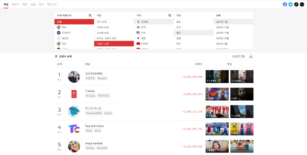 유튜버 김프로(KIMPRO)가 2025년 1월 유튜브 전 세계 월간 조회수 1위를 기록하며 새로운 역사를 썼다.
