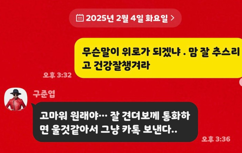 그가 공개한 사진 속엔 구준엽과 대화를 나눈 내용이 담겨있다. 강원래는 "무슨 말이 위로되겠나. 마음 잘 추스르고 건강 잘 챙겨라"고 말하자, 구준엽은 "고마워 원래야. 잘 견뎌볼게. 통화하면 울 것 같아서 그냥 문자 보낸다"라고 답했다.