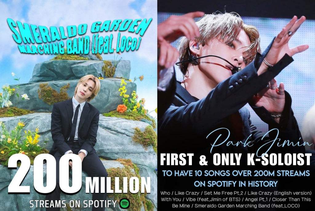 지민의 2집 앨범 'MUSE'(뮤즈) 선공개곡 'Smeraldo Garden Marching Band'(스메랄도가든 마칭 밴드/feat.로꼬)가 지난 8일 세계 최대 음원 플랫폼 스포티파이에서 2억 스트리밍을 넘어섰다.
