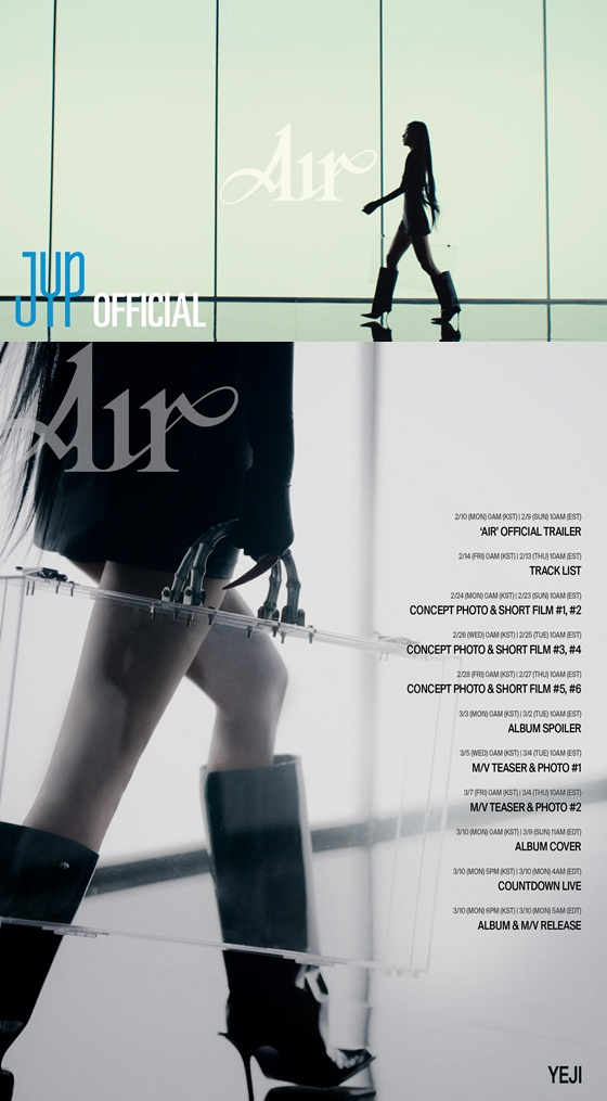 소속사 JYP엔터테인먼트는 10일 0시 공식 SNS 채널에 다음 달 10일 예지의 솔로 1집 앨범 '에어'(AIR)발매 소식 깜짝 발표했다. 이를 알리는 트레일러 영상 및 프로모션 스케줄러를 오픈한 것.