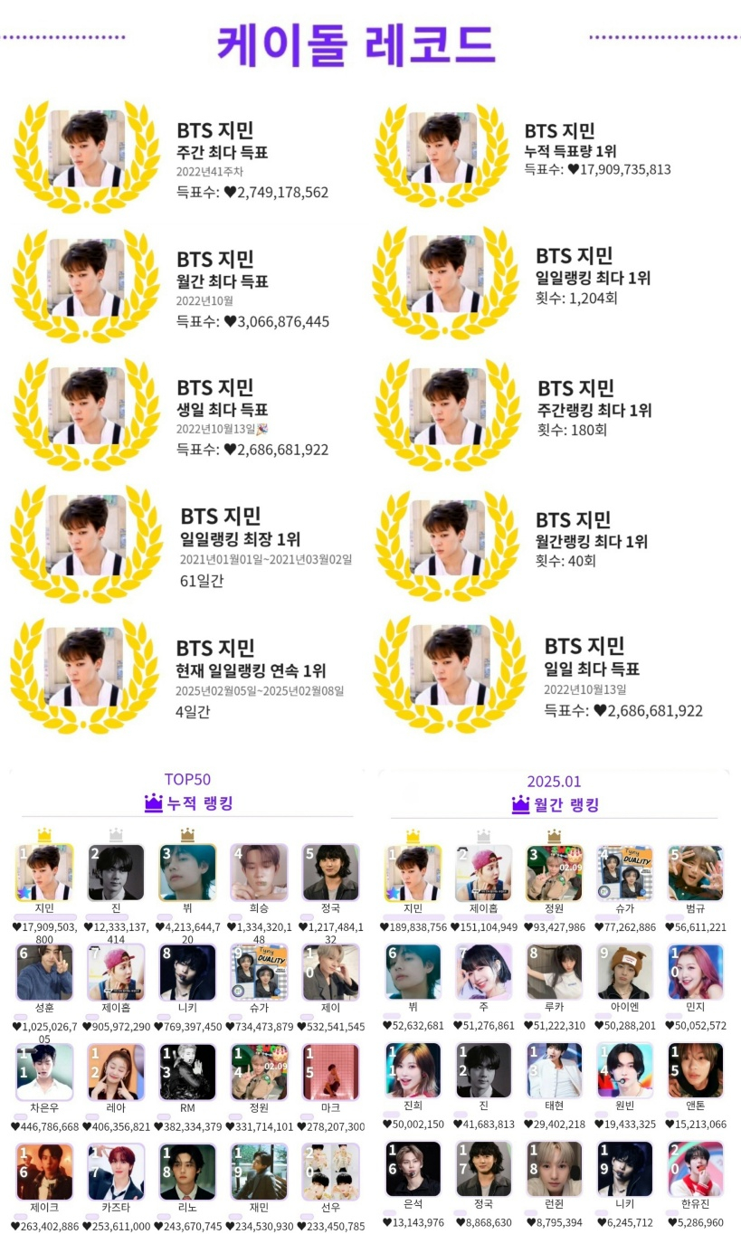 지민은 1월 마지막주(2025년 1월 27일 - 2025년 2월 2일) 주간랭킹에서 5547만 6153개의 하트를 받아 1위를 차지하며 180회째 주간랭킹 1위를 기록했다.