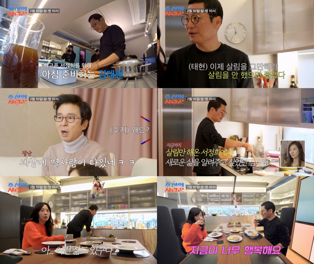 10일 방송될 '조선의 사랑꾼'에서는 서정희의 '6살 연하' 남자친구 김태현이 아침을 준비하는 모습이 포착된다. 능숙한 솜씨로 서정희를 위해 요리를 준비하던 그는 "서정희 씨가 평생 너무 많은 살림을 한 것 같다. 저랑 있을 때만큼은 이제 살림을 안 했으면 좋겠다"고 애정을 드러냈다.