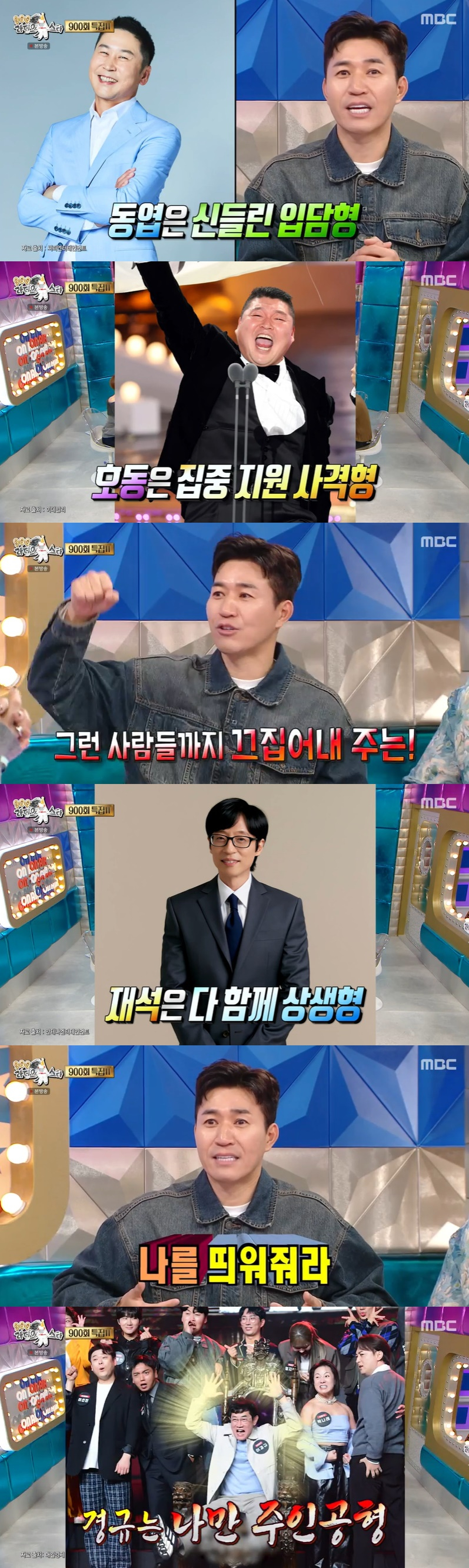 김종민은 신동엽, 강호동, 유재석, 이경규와 두루 함께 활동하며 느낀 점으로 "동엽이 형은 편하게 대화하는 것 같은데 임팩트가 있다. 호동이 형은 컨디션 좋은 한 사람 집어서 딱 띄워준다. 재석이 형은 진흙에 빠져있거나 컨디션이 안 좋은 사람까지 끄집어낸다. 경규 형은 자기를 날려달라고 한다"고 분석했다.