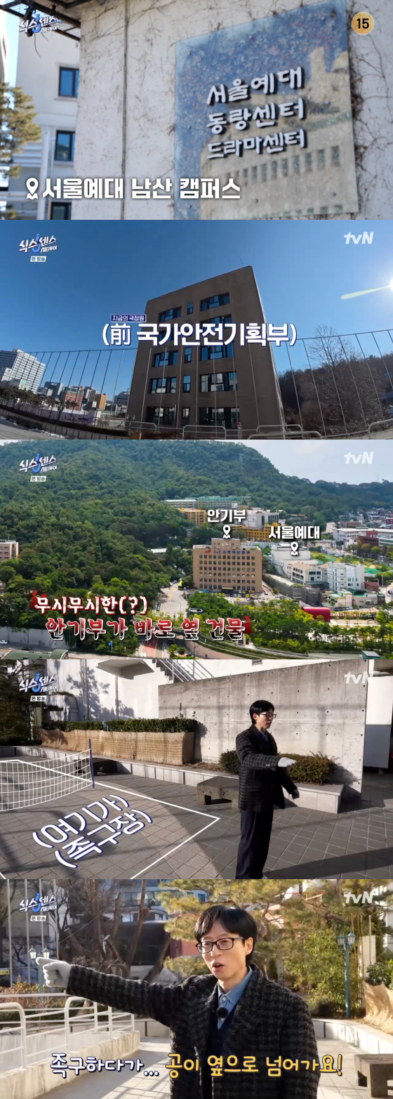 유재석은 예대 옆 건물을 가리키며 "저 건물이 옛날에는 안기부(국가안전기획부)였고 지금은 국정원(국가정보원)이 됐다"고 설명했다.