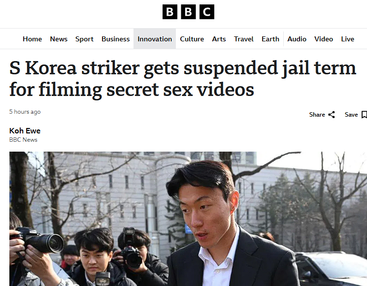 영국 'BBC'는 14일(한국시간) "한국 축구 선수 황의조가 여성과의 성적 관계를 불법적으로 촬영한 혐의로 집행유예형을 선고받았다"고 보도했다. 아울러 매체는 "황의조는 잉글랜드의 노리치 시티와 노팅엄 포레스트에서 활약했고 현재 튀르키예 구단인 알란야스포르에서 뛰고 있다"고 전했다. 해당 기사는 'BBC'의 주요 기사 중 하나로 선정됐다.