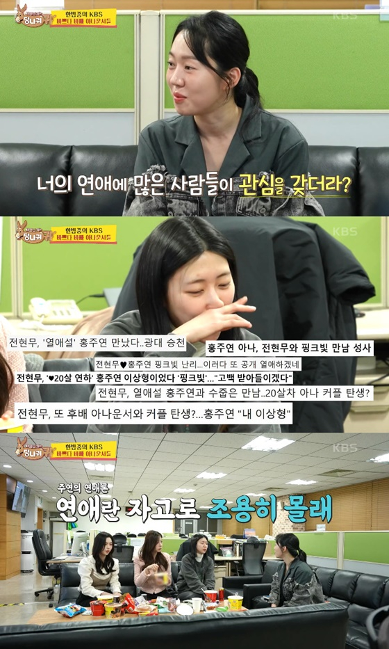 이날 엄지인은 후배 아나운서인 홍주연에게 "네 연애에 많은 사람들이 관심이 많더라"라고 물었다.