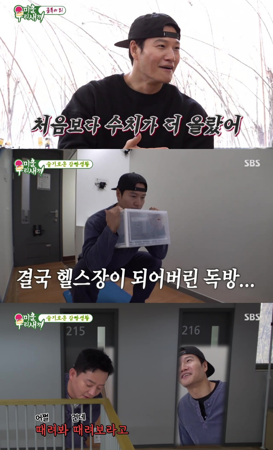 좁은 독방에 갇힌 뒤에도 김종국은 아령 박스를 들고 스쿼트를 했고, 잠긴 문을 믿은 김준호는 김종국에게 "덩어리", "남성호르몬 9의 모기"라며 도발해 웃음을 자아냈다.