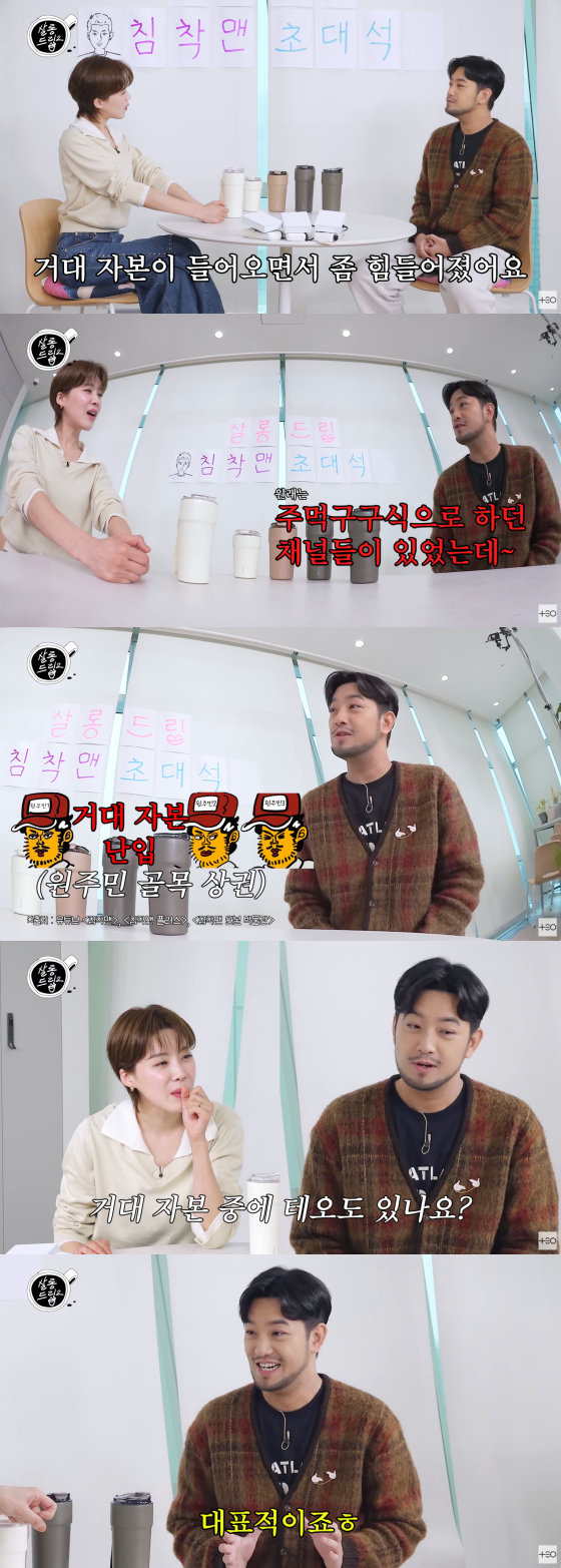 침착맨은 "유튜브가 골목 시장인데 거대 자본이 들어오다 보니 좀 힘들어졌다"며 "원래 주먹구구식으로 하던 채널들이었다. 원주민들이 살고 있었는데 거기에 거대 자본이 들어온 것"이라고 토로했다.