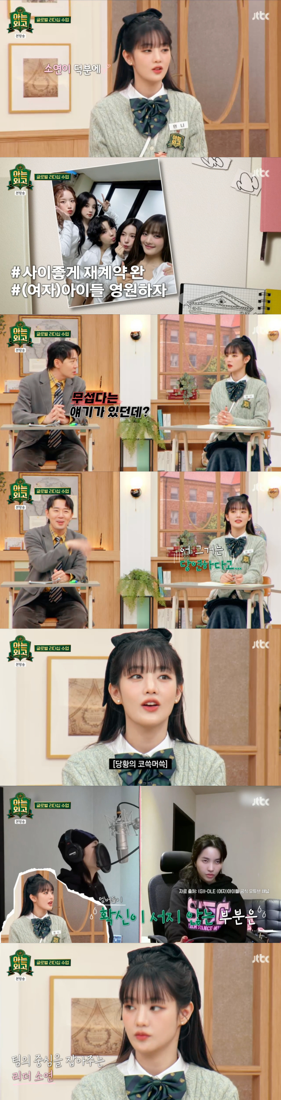 18일 방송된 JTBC 예능 프로그램 '아는 외고'에서는 민니가 소연을 향해 고마움을 표하는 모습이 그려졌다.
