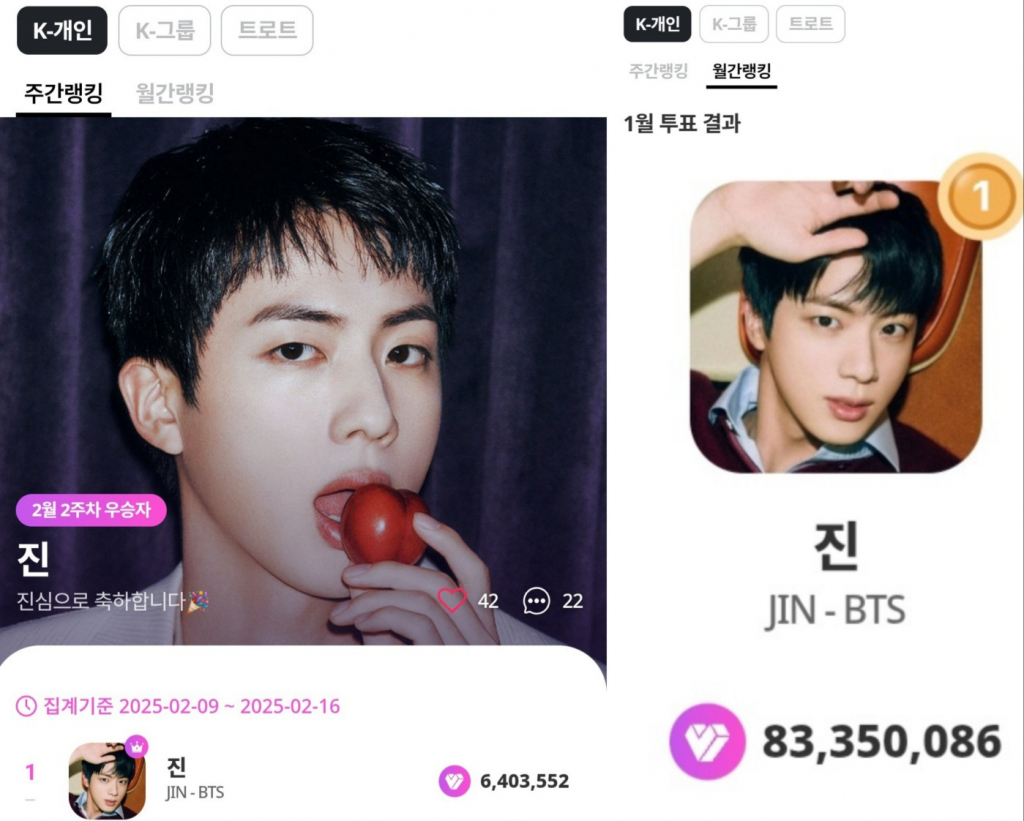 진은 마이원픽 'K-POP 개인 부문 주간랭킹' 2월 2주차(2월 9일~2월 16일) 투표에서 640만 3552개의 하트를 얻어 1위를 차지했다.