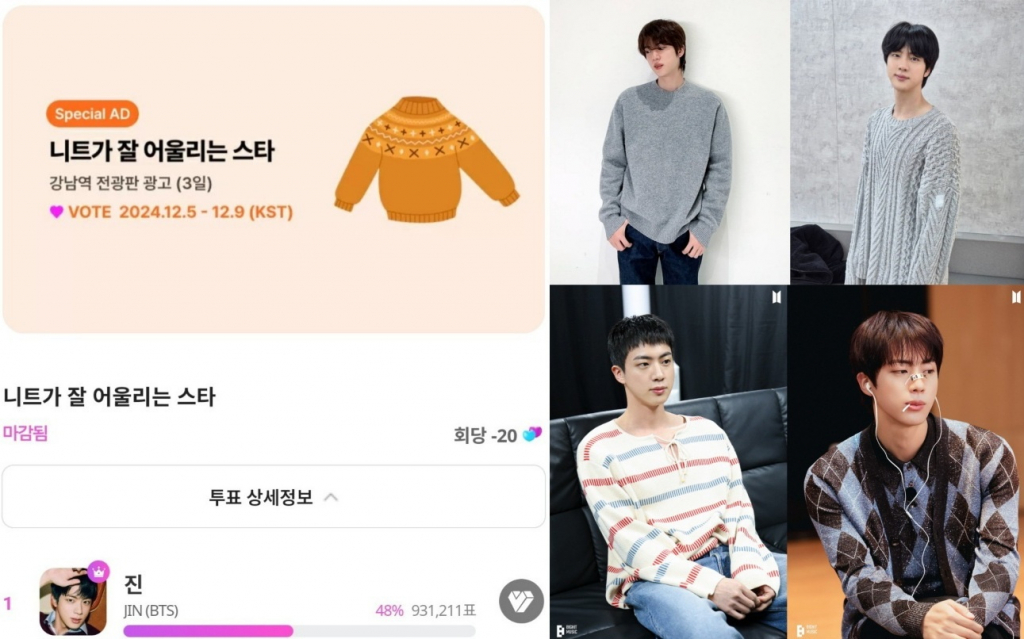 진은 지난해 12월 5일부터 12월 9일까지 진행한 '니트가 잘 어울리는 스타' 투표에서 93만 1211개의 하트를 획득하며 1위에 오르기도 했다. 진의 리워드 광고는 강남역에 2월 18일부터 송출되어 2월 20일까지 만나볼 수 있다