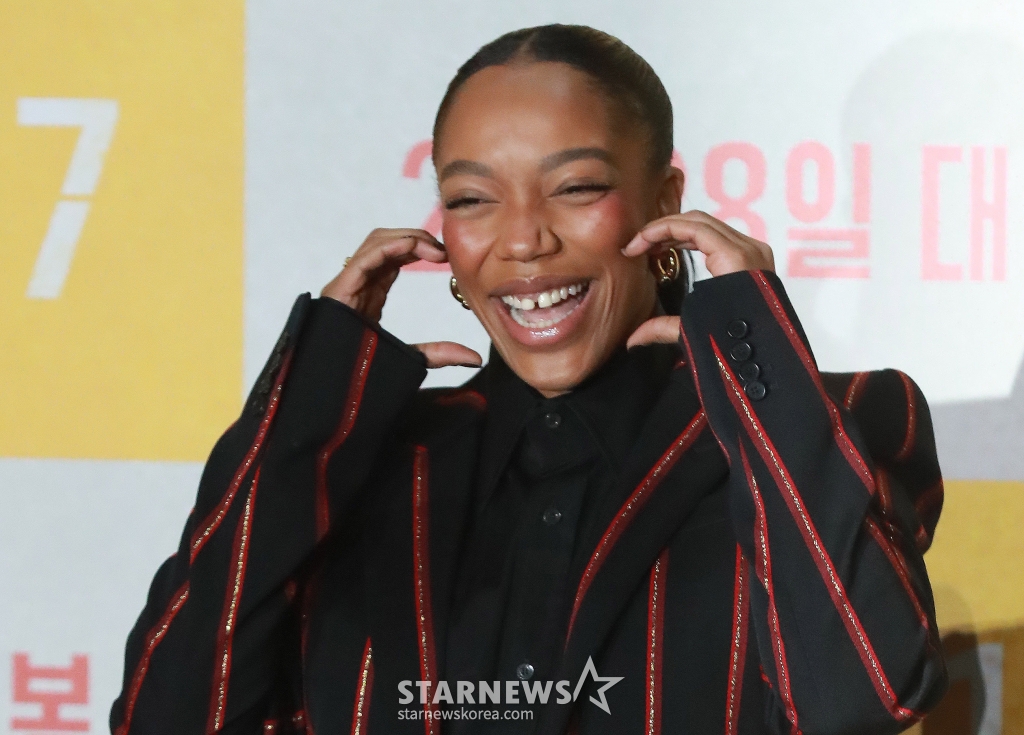 배우 나오미 애키가 20일 오전 서울 강남구 메가박스 코엑스에서 진행된 영화 '미키17'(감독 봉준호) 기자간담회에 참석해 포즈를 취하고 있다.